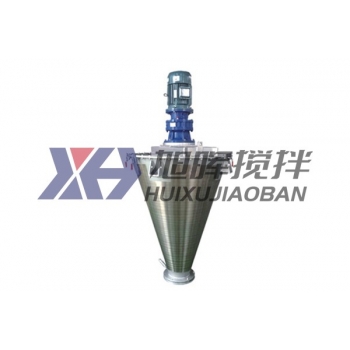 錐形螺帶混合機(jī)由傳動(dòng)機(jī)構(gòu)、錐形筒、外層螺帶攪拌器、內(nèi)層反向螺桿攪拌器和出料閥組成。物料在外層螺帶攪拌器的作用下沿軸向盤旋、提升,內(nèi)層反向螺桿攪拌器將物料沿軸向盤旋下推,完成快速混合動(dòng)作。根據(jù)實(shí)際需求,螺帶可選多種設(shè)計(jì)形式。